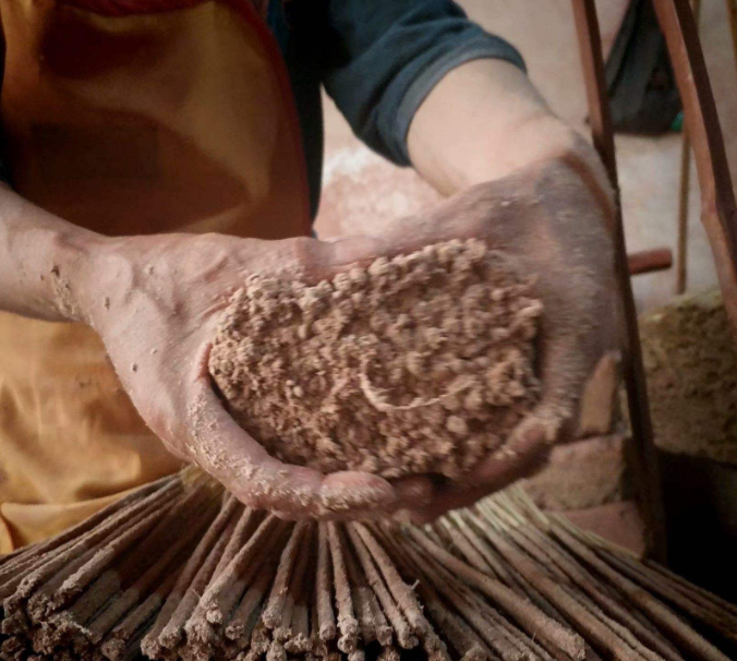 4.吃水的控制:下水盤時應(yīng)該讓整把竹簽和香吃水均勻,出水盤后應(yīng)倒立讓水回流均勻再上粉,上粉,避免大頭鼠尾和大肚。